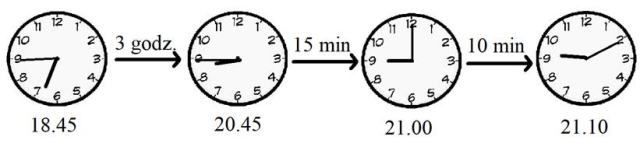Tutaj musisz obliczyć, o której godzinie skończy się koncert w filharmonii, jeśli trwa 3 godziny i 25 minut, a rozpoczął się o 18.45.