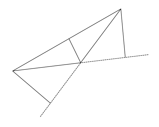 Trójkąt będzie rozwartokątny. Wszystkie trzy wierzchołki są już narysowane. Musisz tylko tak je połączyć, by trójkąt był rozwartokątny. Dwie wysokości muszą być poza trójkątem; są prostopadłe do przedłużeń boków.