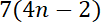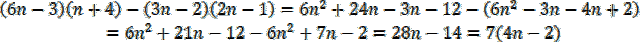 Wymnóż sumy algebraiczne, czyli pomnóż każdy wyraz znajdujący się w jednym nawiasie przez każdy wyraz z drugiego nawiasu, w iloczynie dwóch nawiasów, a następnie zredukuj wyrazy podobne, czyli dodaj/odejmij jednomiany podobne. Na koniec wyłącz liczbę 7 przed nawias w powstałym wyrażeniu.