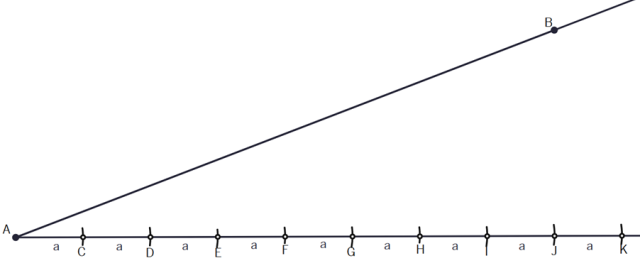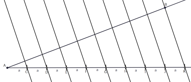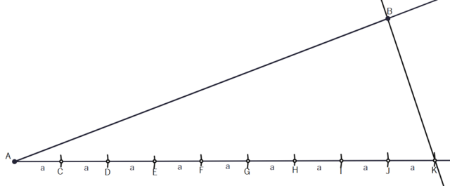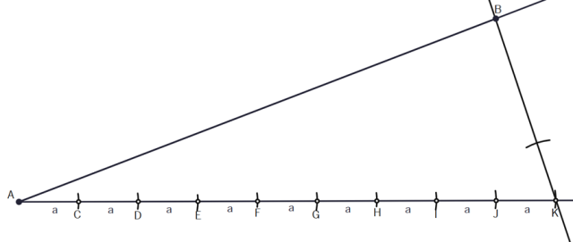 Narysuj dowolny kąt i umieść na jednym jego ramieniu odcinek AB, a na drugim za pomocą cyrkla 9 odcinków takiej samej, dowolnej długości.