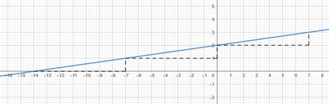 zauważ, że przecina ona oś OY w punkcie (0,2), a wzrost argumentu o siedem jednostek odpowiada wzrostowi funkcji o jedną jednostkę i przedstaw to w układzie współrzędnych.