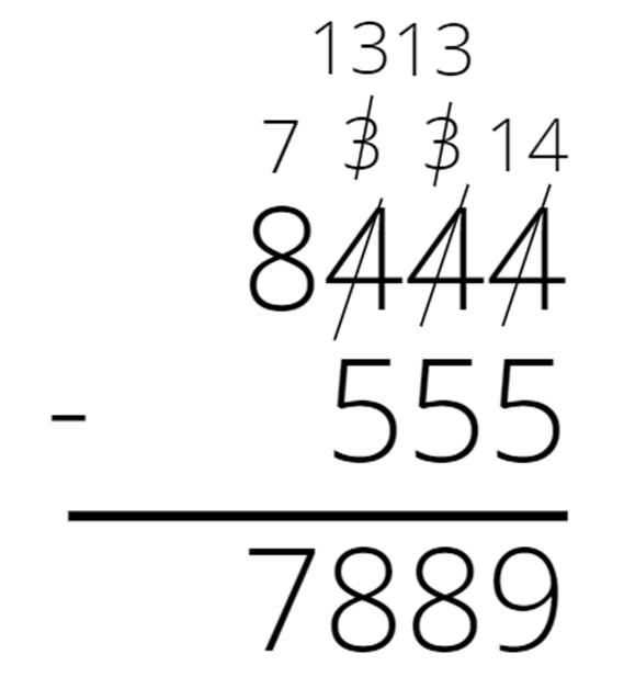 Zapisz liczby jedna pod drugą. Odejmuj kolumnami. Jeśli cyfra górna jest mniejsza od dolnej, to dodaj do niej 10, a cyfrę po lewej stronie zmniejsz o 1 i wykonaj odejmowanie na nowo powstałych liczbach. Jeśli nowo napisana liczba jest mniejsza od dolnej cyfry, to powiększ ją o 10, a następną cyfrę po lewej zmniejsz o 1.