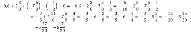 W tym działaniu zacznij od usunięcia wszystkich nawiasów, pamiętając, że + i + dają +, + i – dają – oraz – i – dają +. Dodając ułamki zwykłe, musisz sprowadzić je do wspólnego mianownika. Wspólnym mianownikiem dla liczb 4 i 5 jest liczba 20. Dodając ułamki mieszane – całości dodajesz do całości, a ułamki do ułamków, a następnie, jeśli to konieczne, wyciągasz całości z wyniku dodawania.