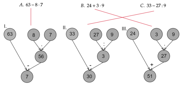 Po połączeniu grafów z działaniami uzupełnij je tak, aby miały sens. Zwróć uwagę, jakie znaki występują na grafach, jeżeli jest znak dzielenia, to musimy do niego wpisać wyrażenie, w którym znajduję się dzielnie.