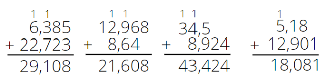 Dodawaj pisemnie tak samo, jak w przypadku liczb naturalnych. Pamiętaj, by liczby zapisać tak, by odpowiednie grupy cyfr (setki, jedności, części setne itd.) były bezpośrednio nad sobą, a przecinek w wyniku był w tym samym miejscu, co w obu składnikach.