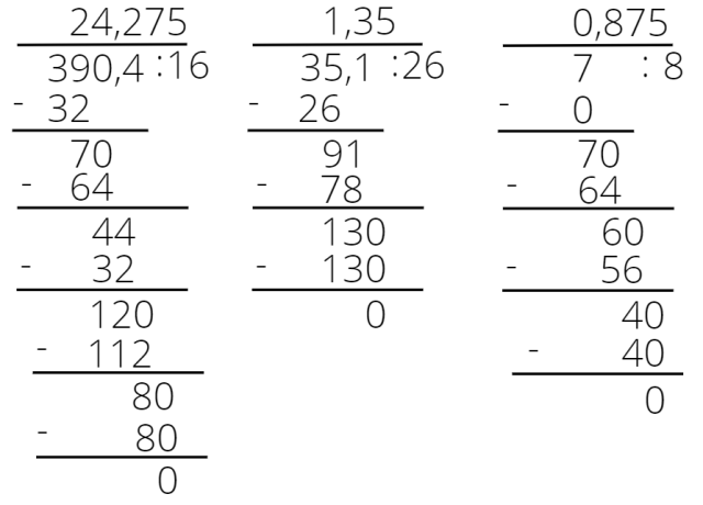 Dzielisz tak samo, jak w przypadku liczb naturalnych, lecz musisz postawić przecinek w wyniku bezpośrednio nad przecinkiem w dzielnej. Jeśli w dzielnej nie ma już liczby, to dopisujesz 0 do reszty i postępujesz w ten sposób, dopóki nie otrzymasz reszty zero.