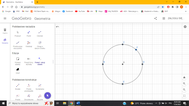 W tym zadaniu musisz skorzystać z przyborów i narysować 5 punktów odległych od punktu A o 2 cm.