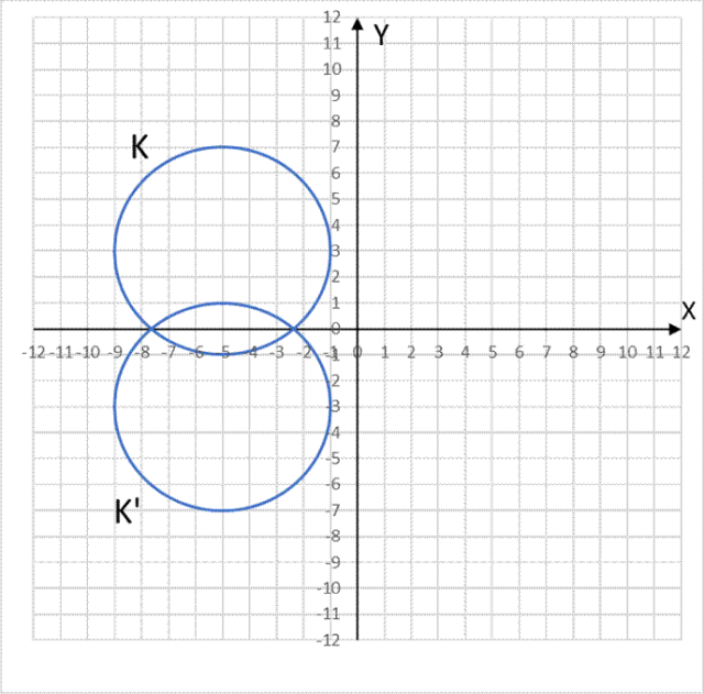 W tym zadaniu wyznacz równania okręgu K’ symetrycznego względem początku układu współrzędnych do okręgu K: (x + 5)2 + (y – 3)2 = 16, a następnie narysuj te okręgi.