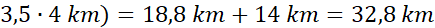 Odległość z B do C przez A: 18,8 km + (