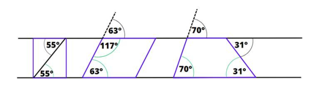 Zauważ, że wszystkie figury mają parę boków równoległych. Przecięcie ich prostą pozwala znaleźć odpowiednie kąty odpowiadające i naprzemianległe.