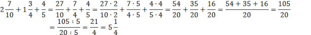 W tym działaniu wspólnym mianownikiem dla liczb 10, 5 i 5 jest liczba 20.