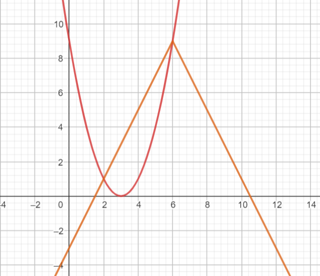 Aby rozwiązać nierówność metodą graficzną, naszkicuj wykresy funkcji odpowiadających stronom nierówności. Rozwiązaniami nierówności są argumenty, dla których wykres funkcji f znajduje się ponad wykresem funkcji g lub wykresy się pokrywają.