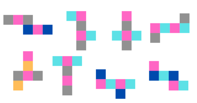 Na rysunkach siatek sześcianu pokoloruj parami ściany, które po złożeniu będą równoległe.