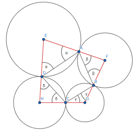 W tym zadaniu musisz udowodnić, iż czworokąt ABCD można wpisać w okrąg, biorąc pod uwagę fakt, iż na płaszczyźnie dane są cztery okręgi parami styczne zewnętrznie w punktach A, B, C, D.