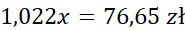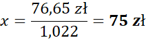 Oznacz cenę akcji początkowych przez x, a następnie ją wyznacz, wiedząc że 1,022x to nowa cena. Pamiętaj, że szukaną liczbę możemy odnaleźć, mnożąc procent przez całość, na przykład: