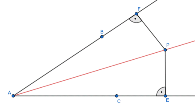 Skoro trójkąty AEP i AFP są przystające, to boki EP i FP są takiej samej długości, więc są równo odległe od ramion kąta DAC.