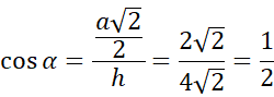 Ze wzoru na pole trójkąta wyznacz długość wysokości przekroju i skorzystaj z funkcji cosinus w trójkącie prostokątnym składającym się z krawędzi bocznej, wysokości przekroju oraz połowy przekątnej podstawy i wyznacz jego wartość oraz miarę kąta, dla której jest ona przyjmowana.