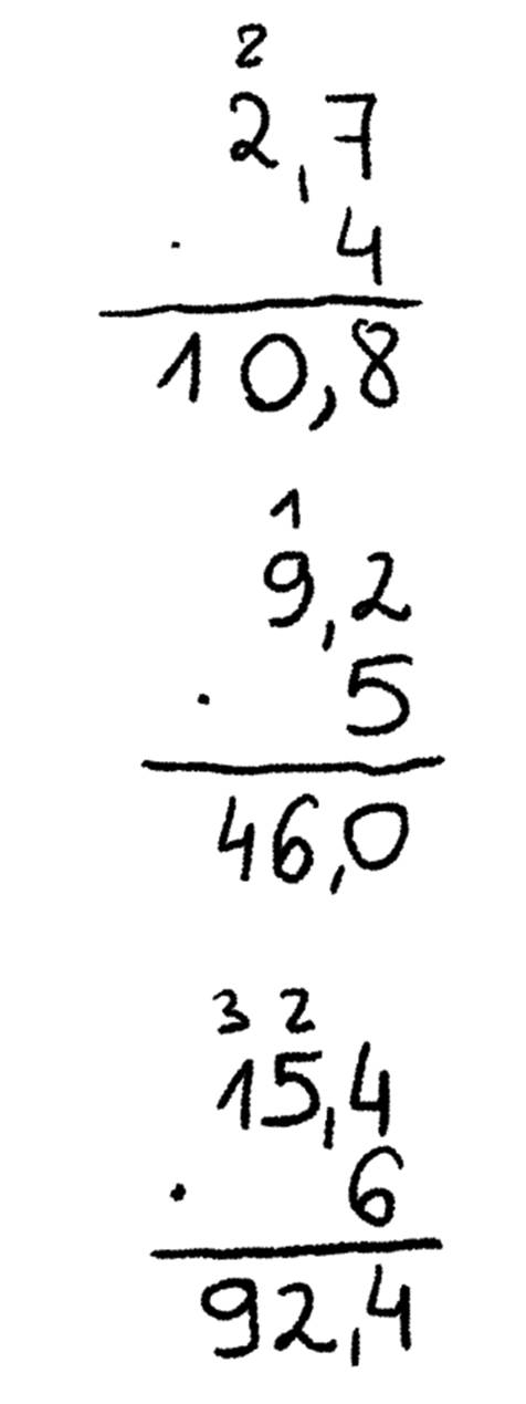 Przy mnożeniu ułamków przez liczbę naturalną zapomnij na chwilę o przecinku. W końcowym wyniku zostaw tyle miejsc po przecinku, ile było w początkowej liczbie.
