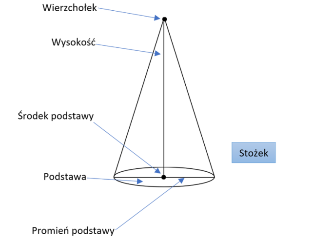 Stożek jest figurą przestrzenną, która powstaje przez obrót trójkąta prostokątnego wokół jednej z przyprostokątnych. Podstawę stożka stanowi koło. Powierzchnia boczna stożka jest wycinkiem koła.