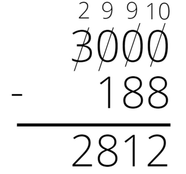 Zapisz liczby jedna pod drugą. Odejmuj kolumnami. Jeśli cyfra górna jest mniejsza od dolnej, to dodaj do niej 10, a cyfrę po lewej stronie zmniejsz o 1 i wykonaj odejmowanie na nowo powstałych liczbach. Jeśli nowo napisana liczba jest mniejsza od dolnej cyfry, to powiększ ją o 10, a następną cyfrę po lewej zmniejsz o 1. Jeśli musimy zmniejszyć o 1 cyfrę 0, to zamień ją na 9 i odejmij o 1 następną cyfrę po lewej stronie.