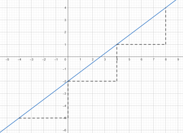 zauważ, że przecina ona oś OY w punkcie (0,-2), a wzrost argumentu o cztery jednostki odpowiada wzrostowi funkcji o trzy jednostki i przedstaw to w układzie współrzędnych.