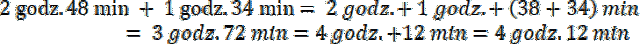 Minuty dodawaj osobno, godziny dodawaj osobno. Pamiętaj, że 60 minut to jedna godzina.