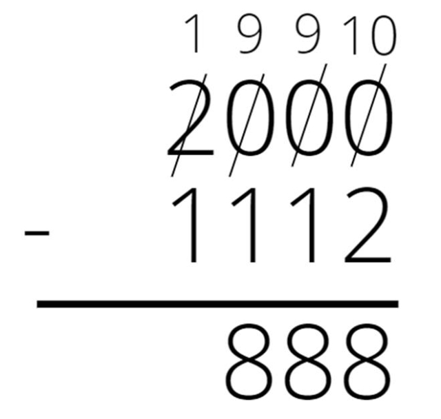 Zapisz liczby jedna pod drugą. Odejmuj kolumnami. Jeśli cyfra górna jest mniejsza od dolnej, to dodaj do niej 10, a cyfrę po lewej stronie zmniejsz o 1 i wykonaj odejmowanie na nowo powstałych liczbach. Jeśli nowo napisana liczba jest mniejsza od dolnej cyfry, to powiększ ją o 10, a następną cyfrę po lewej zmniejsz o 1. Jeśli musimy zmniejszyć o 1 cyfrę 0, to zamień ją na 9 i odejmij o 1 następną cyfrę po lewej stronie.