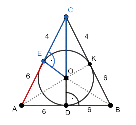 W tym zadaniu wyznacz wysokość CD z twierdzenia Pitagorasa. Zauważ, że odcinki: |AD| = |AE| i |DB| = |BK|–z twierdzenia o odcinkach stycznych, a trójkąty CEO i CDB są podobne–cecha podobieństwa: (kąt–kąt–kąt), wiec skorzystaj ze stosunku podobieństwa trójkątów.
