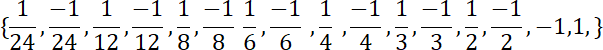 Dzielniki liczby 24: {–24, 24,–12, 12,–8, 8,–6, 6,–4, 4,–2, 2,–1, 1}