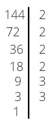144 = 2 ∙ 2 ∙ 2 ∙ 2 ∙ 3 ∙ 3