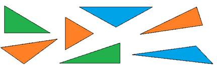 Zamaluj trójkąty odpowiednimi kolorami: pomarańczowym – ostrokątne, zielonym – prostokątne, niebieskim – rozwartokątne.
