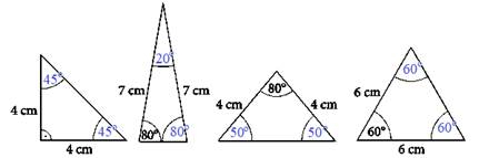 Jeśli trójkąt jest równoramienny, to przy jego podstawie kąty są takie same. Dodatkowo musisz pamiętać, że suma tych kątów ma wynosić 180º.