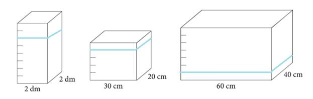 W dwóch pozostałych przypadkach zamień jednostki. 30 cm na 3 dm, 20 cm na 2 dm, 60 cm na 6 dm i 40 cm na 4 dm. W drugim przypadku wysokość musi wynosić 2 dm, czyli 20 cm, a w trzeciej bryle 0,5 dm, czyli 5 cm.