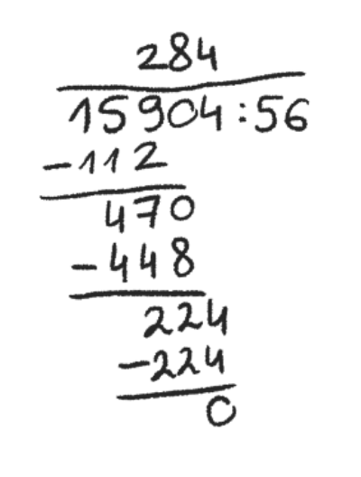 W tym zadaniu musisz wykonać dzielenie pisemne, żeby policzyć, ile palet było potrzebnych, żeby ułożyć 15 904 sztuk, skoro na jednej palecie można zmieścić 56 sztuk kostki brukowej.