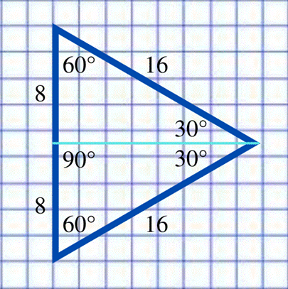 Zauważ, że gdy dorysujemy do pierwszego trójkąta drugi taki sam trójkąt, powstanie trójkąt równoboczny (można to określić po miarach kątów). Bok AB stanowi wysokość nowo powstałego trójkąta, a więc dzieli jego podstawę (o długości 16) na pół. Można wywnioskować, że bok BC jest równy 8.