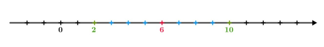 Średnia arytmetyczna liczb 2 i 10 to środek odcinka o końcach w tych punktach.