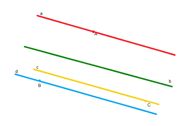 Proste równoległe się pokrywają lub nie mają żadnych punktów wspólnych. Dowolne dwie proste z rysunku są równoległe.