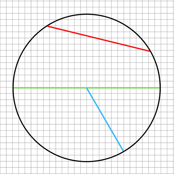 Załóżmy, że jedna kratka to 5 mm. Średnica to odcinek przechodzący przez środek koła, a promień to połowa średnicy. Cięciwa to odcinek łączący dwa punkty na okręgu.