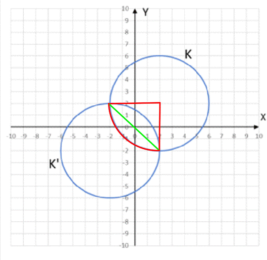W tym zadaniu oblicz pole części wspólnej kół ograniczonych przez te okręgi, wiedząc, że okrąg K’ jest symetryczny do okręgu K (x – 2)2 + (y – 2)2 = 16 względem początku układu współrzędnych.