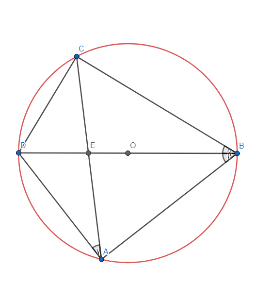 Trójkąt DAB jest prostokątny, ponieważ oparty jest na średnicy okręgu, co oznacza, że kąt przy wierzchołku A jest kątem prostym.
