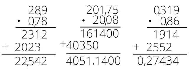 Wymnóż liczby pisemnie bez przecinków tak, jakby były to liczby naturalne. Nie musisz zapisywać tych samych rzędów liczb pod sobą, tylko tak, aby było Ci najwygodniej liczyć. Podczas mnożenia ułamków dziesiętnych zwracasz uwagę na sumę miejsc po przecinku, jakie występują w obu ułamkach i o tyle miejsc przesuwasz przecinek w ostatecznym wyniku w lewo.