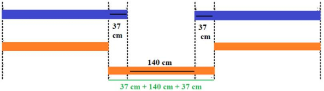pomarańczowa: 37 cm + 140 cm + 37 cm = 74 cm + 140 cm = 214 cm