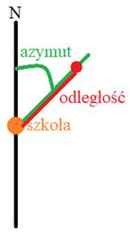 Czas jest podawany na podstawie azymutu i odległości od szkoły. Azymut to kąt między południkiem (północnym) a danym kierunkiem: