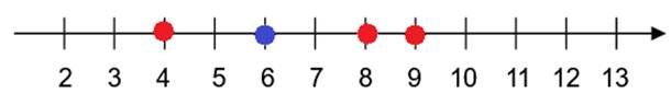 Na rysunku zaznaczasz najpierw czerwonym kolorem liczby, które zostały podane w treści zadania. Ich suma to 4 + 8 + 9 = 18, natomiast są to łącznie 3 liczby, zatem ich średnia to: 18 / 3 = 6. Cyfrę 6 zaznaczasz na rysunku kolorem niebieskim.