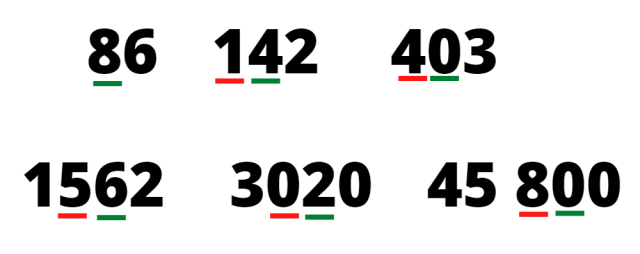 W podanych liczbach zaznacz na zielono cyfrę dziesiątek, a na czerwono cyfrę setek.