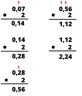 Pomnóż każdą następną liczbę razy dwa. Wykonuj działania pisemne pamiętając, aby przemnożyć każdą liczbę znajdującą się na górze zapisu przez liczby na dole. Wyniki mnożenia zapisuj pod kreską zaczynając od miejsca pod liczbą, przez którą mnożyłeś. Jeśli wynik jest dwucyfrowy, zapisz cyfrę jedności pod kreską, a cyfrę dziesiątek dodaj do następnego wyniku mnożenia. Zwróć uwagę na umiejscowienie przecinka.