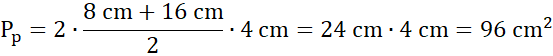 Pole podstawy będzie polem dwóch identycznych trapezów o podstawach 8 cm i 16 cm oraz wysokościach 4 cm:
