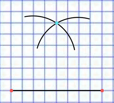 Do konstrukcji trójkąta równobocznego przyda Ci się cyrkiel. Narysuj jeden z boków o długości 4 cm, a następnie odmierz cyrklem 4 cm. Wbij cyrkiel w jeden z punktów (pomarańczowych na rysunku pomocniczym) i narysuj łuki. Miejsce ich przecięcia się to trzeci wierzchołek trójkąta (punkt niebieski na rysunku pomocniczym).