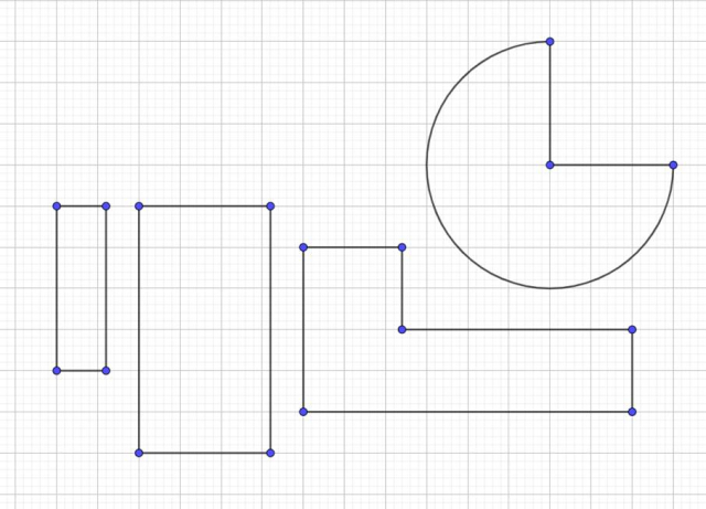 Aby narysować przystające prostokąty, zmierz ich boki. Aby narysować wycinek koła, zmierz promień tego koła. Do zmierzenia odcinków użyj linijki. Kratka ma bok długości 0,5 "cm”.