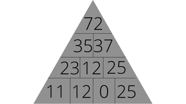 Uzupełnij piramidę, aby suma dwóch liczb dawała liczbę na górze. Pamiętaj, aby przeanalizować piramidę i wpisać liczby w wyznaczone miejsca.